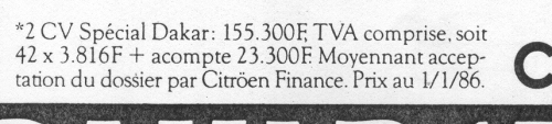 On remarquera ici la date qui est bien antérieure à ce que nous pouvons lire dans la littérature "spécialisée" françaiseLa 2CV Dakar comprend bien entendu des éléments du kit Aventure mais ce n'en est pas moins une série spéciale à part entière. Il est à remarquer que le kit Aventure descend de la 2 CV prototype présentée au Salon 1983 avec dautres voitures de la gamme sous le nom générique de Croisière jeune. Cette 2CV avait exposée par Citroën au salon de "la voiture 4x4 et de Plein Air" du 29 septembre au 9 octobre 1983 Porte de Versailles à Paris.